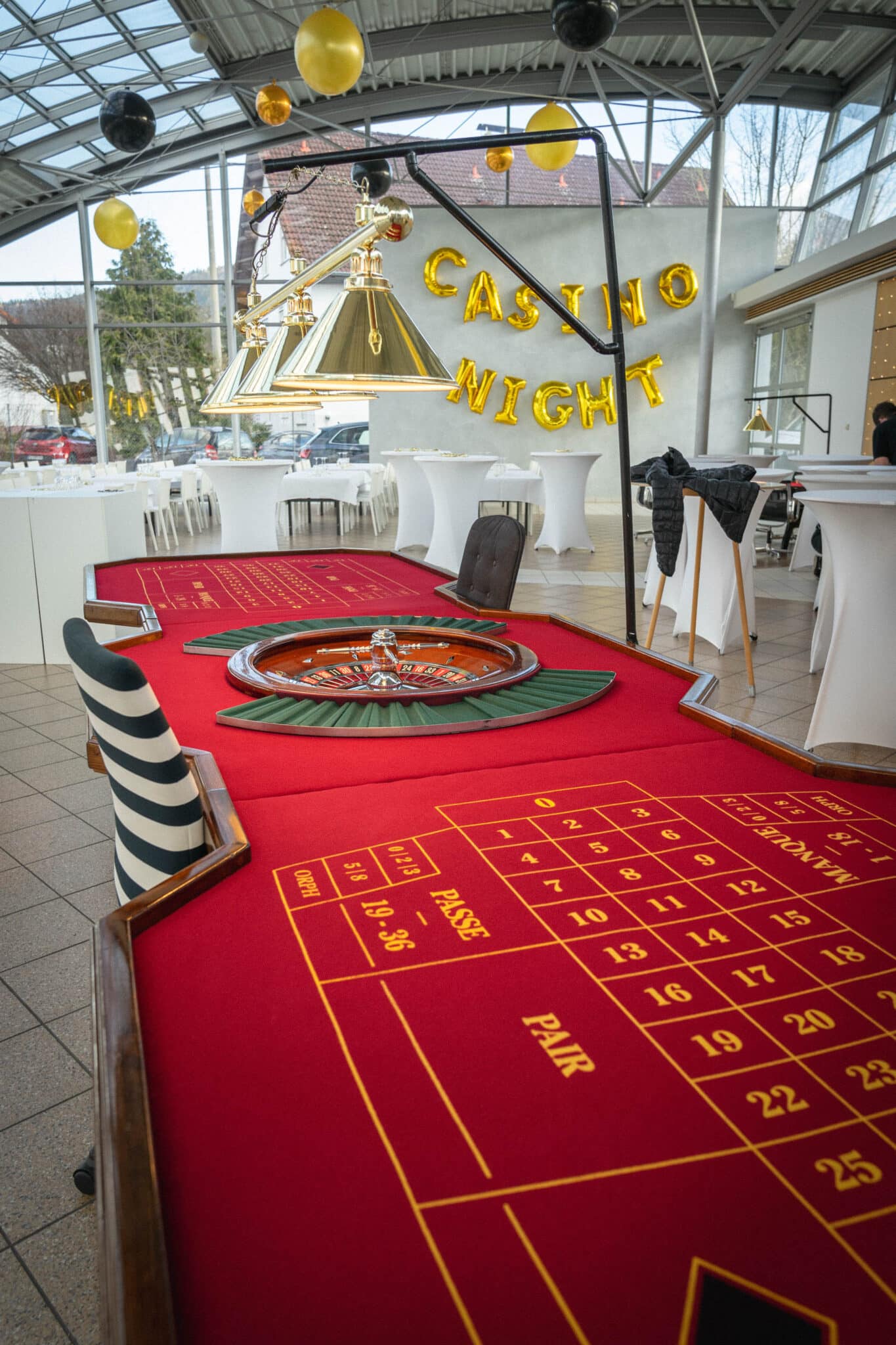 Gut gestärkt folgte das Highlight des Abends: das mobile Spielcasino von Plein & Cheval mit echten Croupiers. Ob am Roulette-Doppeltisch, beim Blackjack, Poker oder am „Chuck-a-Luck“-Würfeltisch, konnte jeder sein Glück versuchen. Vorab erhielt jeder Gast einen 1.000er Spieljeton als Startkapital mit dem Ziel, ihn bis Mitternacht zu vervielfachen.